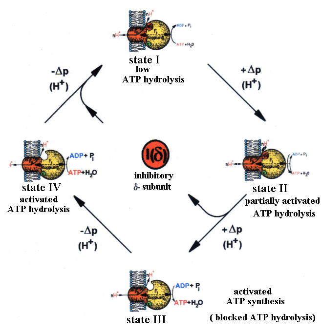 | Fig.2: The changes of structure and function of ATP-synthase from Micrococcus luteus corresponds at a given temperature and ATP/ADP-level to the membrane energization delta-p and the dissociation of the inhibitory delta-subunit (in E. coli : epsilon) (from T20). |