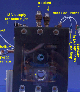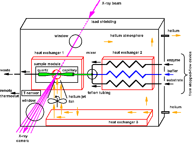 | Fig.12: The helium-jet cooled sample environment SBox2 contains a three-branched thermostat, a mixer and the sample cell module in a helium atmosphere for background reduction. Beam heating is reduced by a helium-jet blowing on the capillary lateral to the X-ray beam (< 1 K). The temperature is regulated in a feedback loop with a PT100 sensor at the sample module, which acts on a remote controlled cooling thermostat. After generation of the active sample from protein and substrate stock solutions, the working enzyme can be continously displaced by a slow stream of drag buffer for reduction of the radiation demage. |