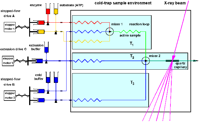 | Fig.14: Sketch of a double jump experiment (cold trap) for the investigation of short livetime events using the novel stopped-flow / temperature jump technique: The active sample is in the first experiment phase generated at temperature T1 with stopped-flow drive1, and deposited in a reaction loop. After a delay (computer control) the working complex is pressed out by buffer with the second drive und rapidly mixed with cold buffer of the temperature T2, yielding a temperature jump to T3. The structure is examined at T3 in the capillary module, which is cooled by a helium-jet. Radiation demage can be diminished by slow continous sample displacement by drag buffer usind drive3 (from ESRF application LS1555). |