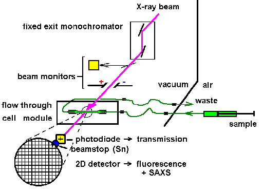 Fig.4: Setup for SAXS, ASAXS and corresponding EXAFS experiments with a flow-through cell using the "true reference method" for structure investigation of protein and metal label solutions as used at the JUSIFA beamline (B1), DESY-HASYLAB, Hamburg, (from S38). |