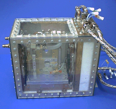 Fig.15: The modular sample environment SBox4 is constructed for low background high-precission experiments with spectroscopy, X-ray and neutron scattering. The sample cell is cooled by two helium jets. It can be observed with an internal CCD camera. The three thermostats at the right hand side allow temperature jump experiments with the stopped-flow / cold trap method. This enviroment has been used at ESRF Grenoble, beamlines ID1, ID2A and ID24, and at DESY-HASYLAB Hamburg, beamline BW4 (USAXS); a smaller version without temperature jump equipment (SBox2) also at ELETTRA Trieste, beamline 5.2 (SAXS). |